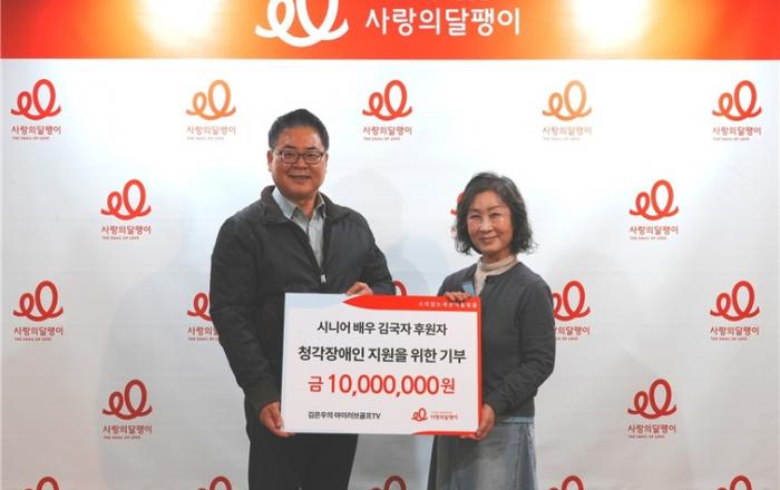 청각장애인을 지원하는 사단법인 사랑의달팽이(회장 이행희)에 시니어 배우 김국자가 청각장애인 지원을 위해 1000만원을 기부했다. 지난 17일 사랑의달팽이 사무국에서 김국자 후원자를 비롯해 개그맨 김은우 사랑의달팽이 홍보대사와 강민희 내외가 참석해 기부금 전달식을 가졌다