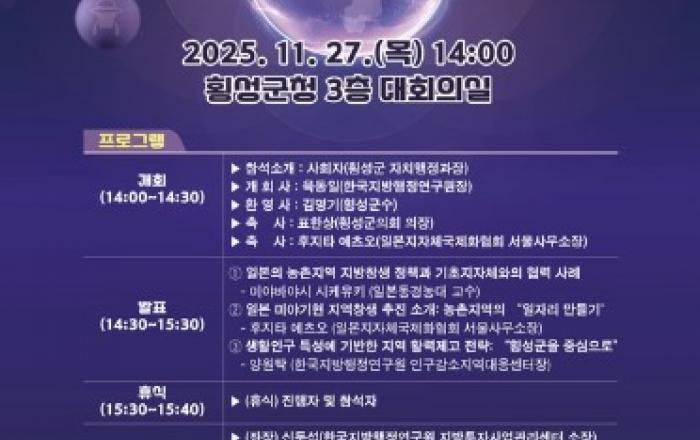 한국지방행정연구원(원장 육동일)은 11월 27일(목) 오후 2시 횡성군청 3층 대회의실에서 ‘지역살리기 포럼 - 횡성지역 활력제고 전략’을 개최한다. 이번 포럼은 ‘인구감소 시대 농촌지역의 지속가능한 지역발전 정책 방향과 지역경제 활성화’를 주요 내용으로 횡성군의 지역
