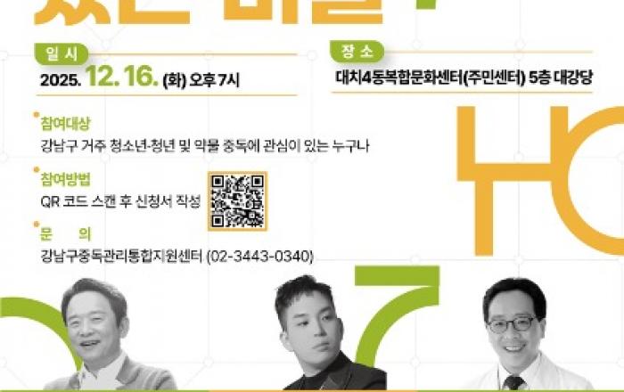 강남구중독관리통합지원센터는 오는 12월 16일 대치4동복합문화센터(대치4동주민센터)에서 청소년·청년 및 부모를 대상으로 ‘약물 중독 예방을 위한 토크 콘서트 ‘말할 수 있는 비밀’’을 개최한다고 밝혔다.이번 토크 콘서트에는 인천참사랑병원 천영훈 원장(중독 전문가), 가