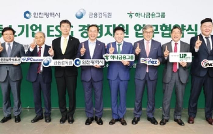 하나금융그룹은 10일 인천 청라에 위치한 하나금융그룹 글로벌캠퍼스에서 인천광역시청, 금융감독원과 함께 중소기업 ESG 경영지원을 위한 업무협약을 체결했다고 밝혔다. 이날 협약식에는 유정복 인천광역시장, 이복현 금융감독원장, 김진용 인천경제자유구역청장, 함영주 하나금