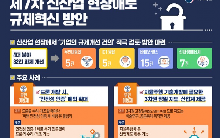 정부는 신산업 현장에서 과제를 발굴하고 신산업규제혁신위원회 중심으로 검토해 드론, ICT, 의료기기, 신재생에너지 등의 신산업 현장애로 32건을 개선하기로 했다.개선과제 32건은 ▲드론 행정절차 개선, 선제적 제도 정비 등 무인이동체 관련 5건 ▲공간정보 활용 개선,