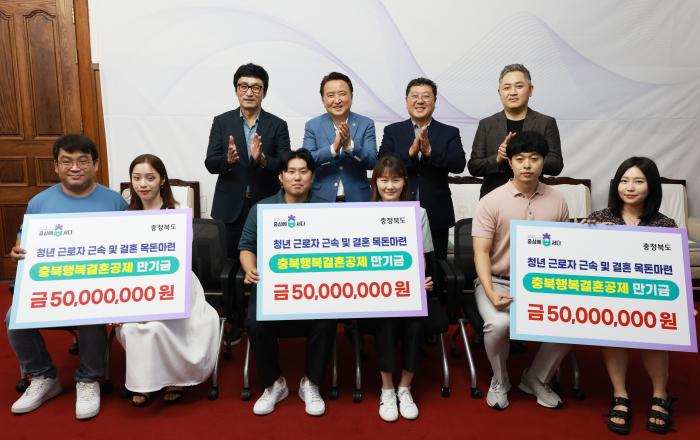 충북도는 14일 도청 여는 마당에서 기업체 대표, 청년 근로자와 배우자가 참석한 가운데 충북 행복결혼공제사업 첫 만기금 수령을 기념하는 행사를 개최했다. 충북도에서 청년들의 결혼 및 기업체 장기재직을 유도하기 위해 시행하고 있는 행복결혼공제 사업은 중소기업 미혼 청