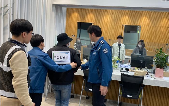 경기도는 19일 청사 열린민원실에서 휴대용 영상 촬영 장비를 활용한 폭언․폭행 등 특이민원 발생 대비 모의훈련을 실시했다. 이날 모의훈련은 민원인이 상담 도중 공무원에게 폭언, 폭행과 함께 기물을 파손하는 상황을 가정하고 ▲