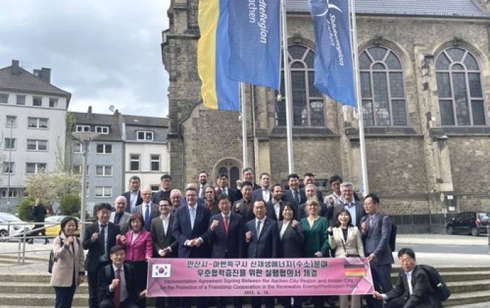 안산시는 지난 18일(현지시간) 독일 아헨특구시와 수소 등 신재생에너지 분야에서 내실 있는 협력을 전개하기 위한 실행협의서를 체결했다고 19일 밝혔다. 이날 아헨특구시청에서 진행된 협약식은 양 기관 실무자들이 참석한 가운데, 이민근 시장과 팀 그뤼테아이어 아헨특구시