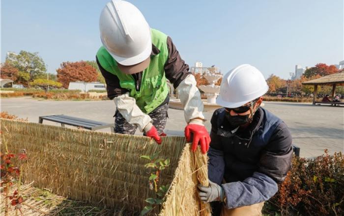 서울시 한강사업본부는 강변의 특성상 겨울철 매서운 바람이 많이 부는 한강공원의 꽃나무 등 녹지대 추위 피해를 방지하기 위해 월동준비를 시작했다고 9일 밝혔다.한강공원 녹지대 월동준비는 11개 한강공원 전역에서 실시하며, 추위에 약한 꽃과 나무 등을 짚으로 싸고, 숙근초