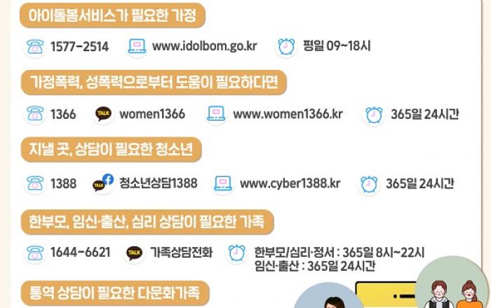 추석 연휴 기간 아이돌봄서비스 이용 시 휴일 가산요금이 아닌 평일 요금이 적용된다. 또 위기청소년, 가정폭력·성폭력 등 폭력피해자 및 다문화가족 등을 위한 상담·보호 서비스 지원도 정상 운영된다. 여성가족부는 추석 연휴기간 아이돌봄 등 민생 서비스를 정상 운영한다