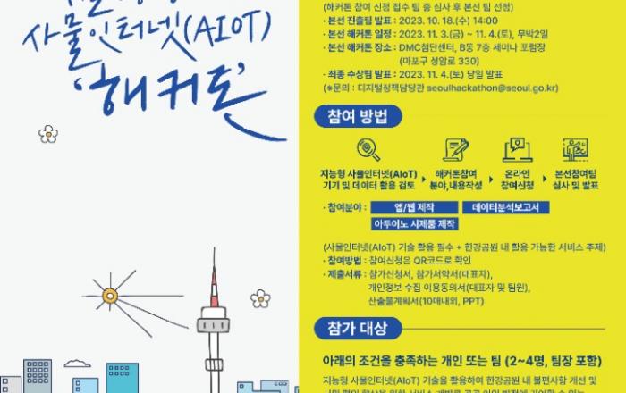 서울시는 지능형 사물인터넷(AIoT) 기기와 데이터를 활용해 한강공원의 시민 불편사항을 해결하는 아이디어 모집을 위한 ‘2023년 서울 지능형 사물인터넷(AIoT) 해커톤 공모전’을 개최한다고 밝혔다. 지난해에 이어 올해 두 번째로 개최되는 공모전은 지능형 사물인터넷(