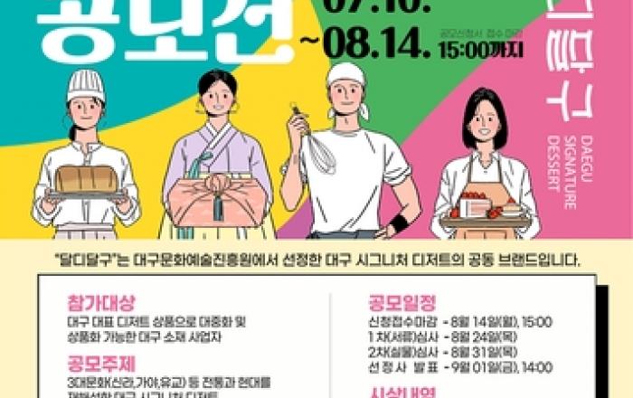 대구광역시와 (재)대구문화예술진흥원(이하 '진흥원') 관광본부는 대구만의 차별화된 이미지와 스토리를 담은 대구 대표 디저트 공모전을 개최한다. 대구 3대문화권 관광진흥사업의 일환으로 추진되는 '대구 시그니처 디저트 공모전'은 대구만의 독특한 특성과 지역의 차별화된