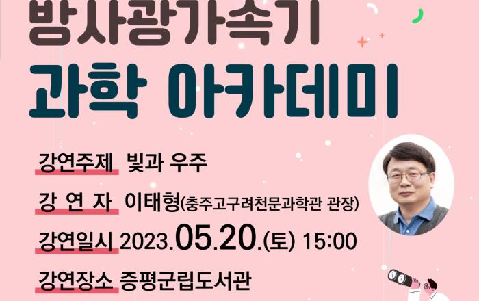 충청북도와 충북과학문화거점센터는 가속기의 기초가 되는 기초과학분야의 강연을 통해 기초과학에 대한 대중의 이해도를 높이고, 충북 청주에 구축중인 방사광가속기에 대한 도민 홍보를 위해 5월 20일(토) 오후3시에 증평군립도서관에서 가속기아카데미를 개최한다. 이번 가속기
