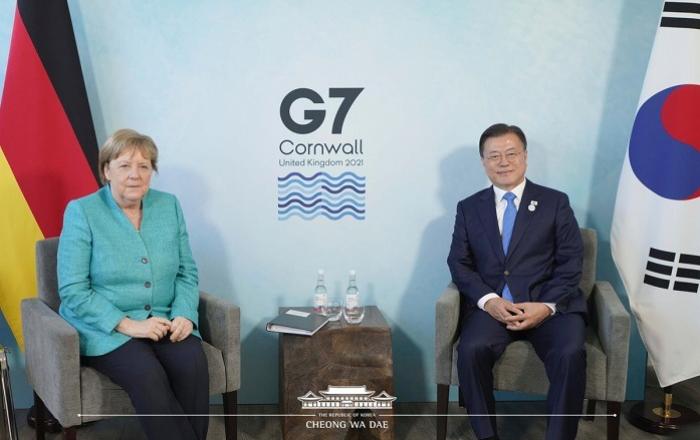 G7 정상회의 참석차 영국을 방문 중인 문재인 대통령은 12일(현지시간) 오후 앙겔라 메르켈 독일 총리와 회담을 갖고 G7 정상회의, 코로나19 대응, 한반도 정세 등에 대해 폭넓게 논의했다.문 대통령과 메르켈 총리는 양국의 코로나 대응 성과에 대해 긍정적으로 평가하며