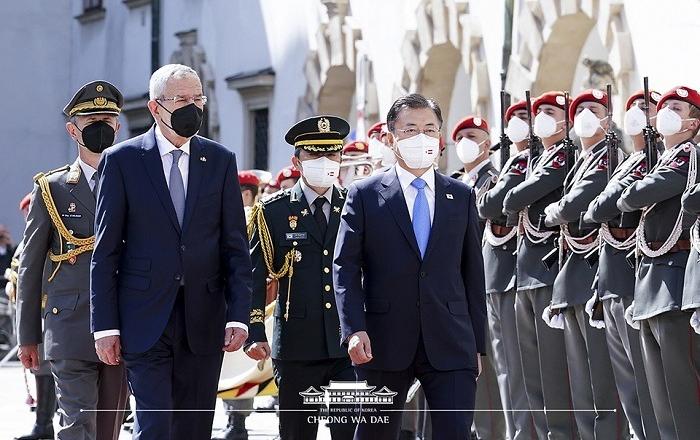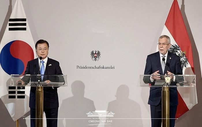 오스트리아를 국빈 방문 중인 문재인 대통령은 14일(현지시간) 수도 비엔나의 호프부르크 궁에서 열린 공식 환영식에 이어 판 데어 벨렌 대통령과 정상회담을 갖고 ▲양국 관계 ▲기후·환경 등 글로벌 현안 ▲한반도 및 국제 정세 등에 대해 폭넓게 논의했다.한국 대통령이 오스