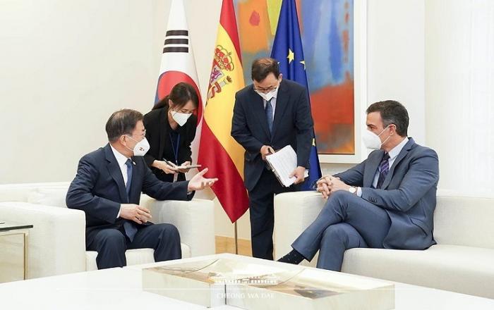 스페인을 국빈 방문 중인 문재인 대통령은 16일(현지시간) 페드로 산체스 스페인 총리와 회담을 갖고 ▲양자 관계 발전 방안 ▲경제·문화 등 실질 협력 증진 ▲한반도 등 지역 정세 ▲글로벌 현안에 대해 폭넓게 의견을 교환했다.문 대통령과 산체스 총리는 양국이 1950년