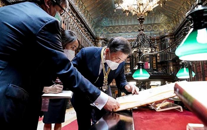 스페인을 국빈 방문 중인 문재인 대통령은 16일(현지시간) 스페인 상·하원 합동 연설을 마친 후 마리아 필라르 욥 쿠엔카 상원의장, 메리첼 바텟 라마냐 하원의장과 함께 스페인 상원 도서관을 방문했다.문 대통령은 안헬 곤잘레스 도서관장으로부터 상원도서관이 소장하고 있는