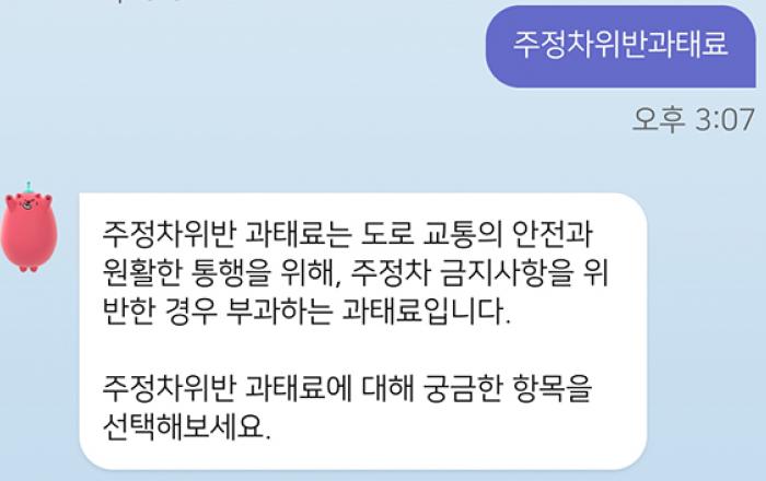 채팅로봇 ‘위택스봇’을 통해 지방세 외에도 주정차위반 과태료와 환경개선부담금 등 일상생활과 밀접한 세외수입 상담이 24시간 가능해진다. 행정안전부는 6일 주정차위반 과태료 등 세외수입에 대한 종류별 부과금액, 납부방법 등 궁금한 사항을 상담하고 안내해주는 ‘위택스