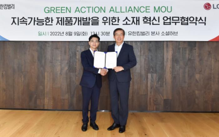LG화학은 유한킴벌리 본사에서 LG화학 신학철 부회장과 유한킴벌리 진재승 대표이사가 참석한 가운데 ‘지속 가능한 제품 개발을 위한 소재 혁신 업무 협약(MOU), 그린 액션 얼라이언스(Green Action Alliance)’를 체결했다고 10일 밝혔다. 이번 협약으로