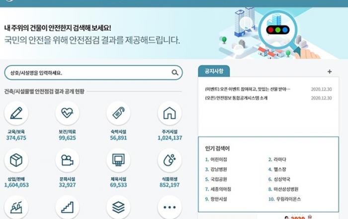 앞으로 아이들이 일상을 보내고 있는 학교와 어린이집, 체육시설 등의 안전점검 정보를 쉽고 편리하게 찾아볼 수 있게 된다.행정안전부는 건축물·시설물의 기본정보와 각종 안전 점검·진단 등의 결과를 한 곳에서 종합적으로 확인할 수 있도록 안전정보 통합공개시스템을 구축, 인터