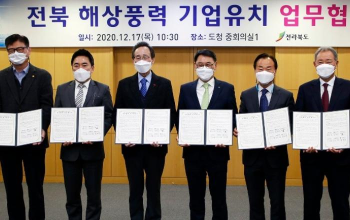 두산중공업은 17일 전라북도와, 지역 해역에 해상풍력발전단지를 조성하기 위한 기업 유치 업무 협약을 체결했다고 밝혔다. 이날 도청에서 열린 협약식에는 송하진 전북도지사와 정연인 두산중공업 사장 등 관계자들이 참석했다.이번 협약을 통해 전라북도는 두산중공업을 포함한 국내