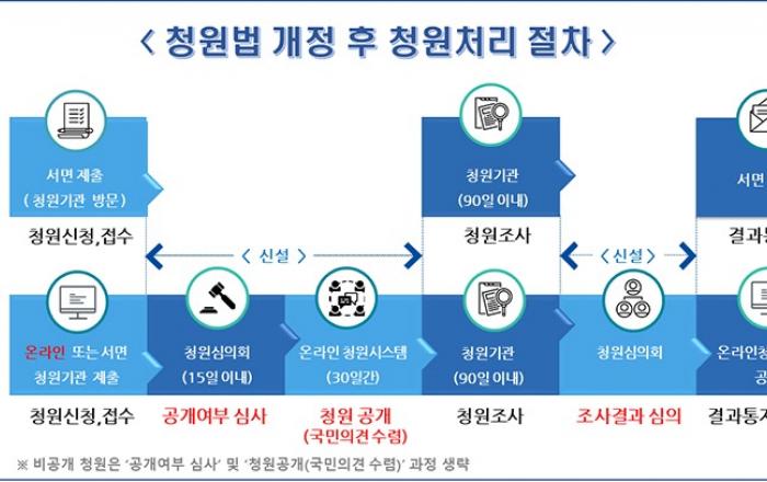 ‘청원법’이 60년 만에 전면 개정됨에 따라 현재 서면으로만 가능했던 ‘청원신청’이 온라인으로 제출할 수 있고, 국민이 청원을 신청하면 ‘청원심의회’를 거치도록 하는 등 처리 절차도 강화된다.행정안전부는 이와 같은 내용을 담은 ‘청원법’ 전부개정법률이 15일 국무회의