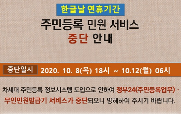 행정안전부는 6일 차세대 주민등록시스템 출범을 2020년 10월 5일에서 12일로 1주일 연기한다고 밝혔다.행안부는 20년이 넘은 전국 229개 시·군·구의 노후화된 주민등록시스템을 웹(Web) 기반의 최신 정보기술 환경으로 통합 구축하기 위한 차세대 주민등록시스템 1