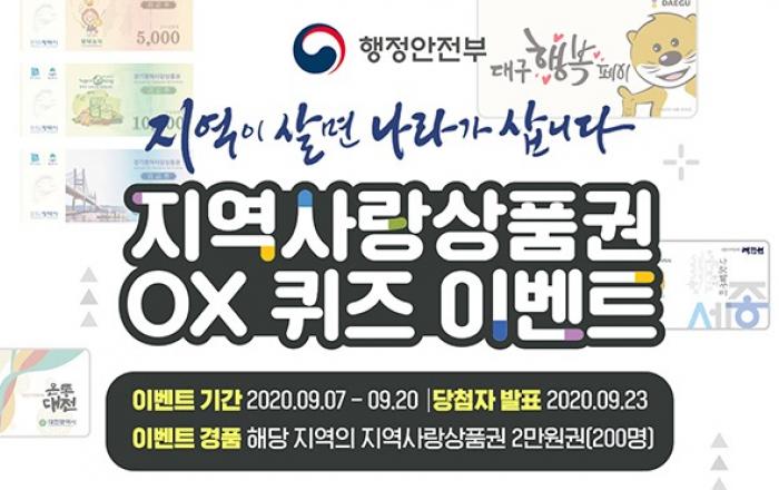 행정안전부는 다가오는 민족 대명절 추석을 맞이해 ‘지역사랑상품권’을 증정하는 이벤트를 20일까지 진행한다고 밝혔다.이번 이벤트는 지역 상품권 사용 등으로 코로나19에 따른 지역경제의 침체 위기를 돕고 추석 명절 동안 골목상권 활성화를 위해 추진됐다.특히 지역 소상공인들