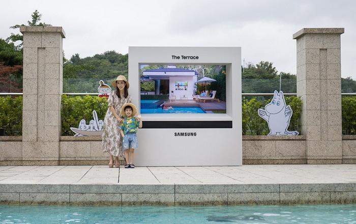 삼성전자가 아웃도어용 라이프스타일 TV ‘더 테라스(The Terrace)’를 국내에서는 처음으로 서울신라호텔 야외 수영장 ‘어번 아일랜드’ 키즈풀에 설치했다.더 테라스는 주택의 야외 공간이나 레저 시설에 설치해 실외에서도 고화질 영상을 즐길 수 있도록 한 TV로, 지