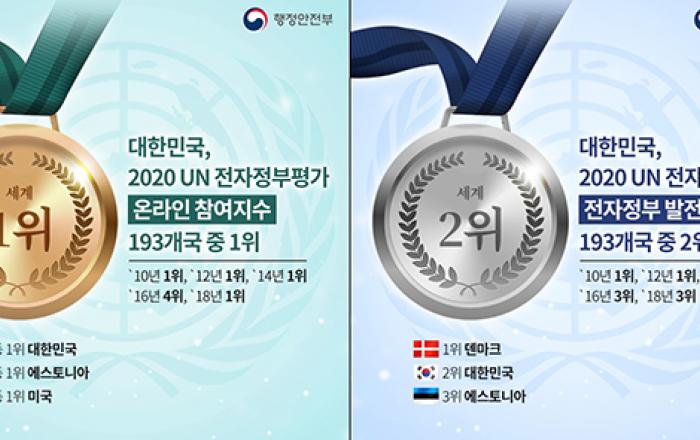 우리나라가 2020년도 UN 전자정부평가에서 193개 회원국 중 전자정부발전지수 2위(1위 덴마크), 온라인참여지수 공동 1위(한국, 미국, 에스토니아)를 기록했다. 행정안전부는 국제연합(UN)이 지난 10일 10시(한국시간 11일 0시) 뉴욕 본부에서 이와 같은 내