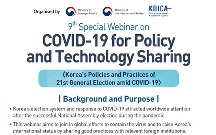 정부는 8일 오후 4시(한국시간)부터 코로나19 대응 ‘K-방역’ 관련 정책과 경험을 전 세계에 공유하는 제9차 웹세미나를 개최한다. 이번 웹세미나는 우리 방역 경험을 주제별로 구성하여 국제사회와 체계적으로 공유하는 ‘K-방역’시리즈의 마지막 세미나로, 행정안전부가