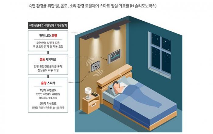 현대건설은 건설업계 최초로 숙면환경 조성을 위한 침실 스마트 아트월 상품 ‘H 슬리포노믹스(Sleeponomics)(가칭)’를 선보인다.이번 침실 스마트 아트월 상품은 숙면 메커니즘에 따라 수면준비단계, 수면단계, 각성단계, 각성이후단계 등 단계별로 천장과 벽면으로 구