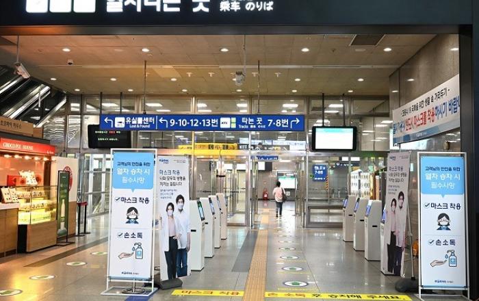 한국철도(코레일)가 서울, 대전, 광주송정, 부산 등 전국 10개 주요 역에 자동분사형 손소독기를 설치하는 등 방역을 강화하고 있다고 밝혔다.▲ 한국철도는 전국 주요 역 타는 곳에 손소독기를 설치 운영하는 등 코로나 확산 방지를 위해 방역을 강화하고 있다.※ 대상역 :