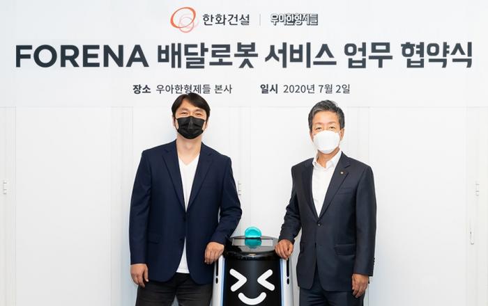 한화건설(대표이사 최광호)은 7월 2일 송파구 방이동 우아한형제들 사옥에서 ‘FORENA(포레나) 배달로봇 서비스 업무협약’(MOU)를 체결했다고 밝혔다.협약식에는 한화건설 윤용상 건축사업본부장, 우아한형제들 윤현준 부사장과 관계자들이 참석한 가운데 진행됐으며, 배달로