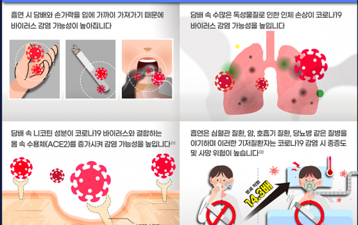 보건복지부가 “흡연은 코로나19의 감염 가능성과 환자의 중증도·사망 위험을 높이므로 코로나19 유행 상황에서 국민의 금연 실천이 더욱 중요하다”고 강조했다. 복지부는 1일 이를 위해 관련 정보를 쉽게 이해할 수 있도록 인포그래픽, 팩트시트(간단한 보고서), 카드뉴스를