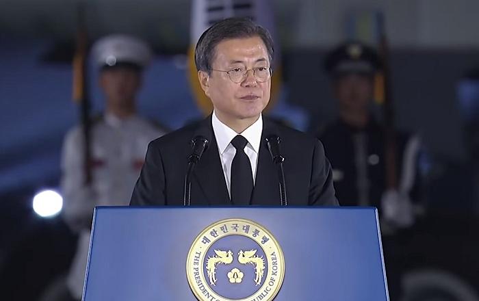 문재인 대통령은 25일 오후 8시 20분 국가보훈처 주최로 경기도 성남 서울공항 격납고에서 열린 6·25전쟁 제70주년 행사에 참석했다. 70년 만에 귀환하는 국군전사자 유해봉환과 함께 열린 이번 행사는 6·25전쟁 당시 국가를 지키려 헌신한 모든 이들에게 경의를