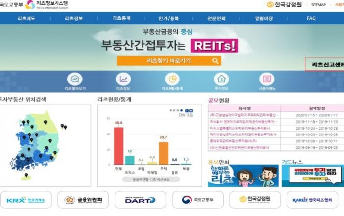 국토교통부는 리츠(REITs·부동산투자회사) 시장질서 조성을 위해 5월 18일부터 한국감정원에 리츠 신고·상담센터를 신설*한다.리츠시장 자산규모가 약 51조 원으로 확대되는 과정에서 관련 피해사례·유형 등이 다양화되어, 이에 대응하기 위한 전문적인 신고·상담창구의 신설