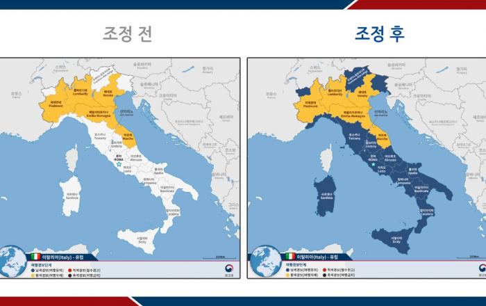 외교부는 3월 11일(수)부로 이탈리아 전역[기존의 여행경보 2단계(황색경보, 여행자제) 발령 지역 제외]에 대한 여행경보 1단계(남색경보, 여행유의)를 추가 발령하였습니다.이번 여행경보 추가 발령은 이탈리아 내 코로나19 확진자가 전국적으로 확산되고 있고 전국적인 이