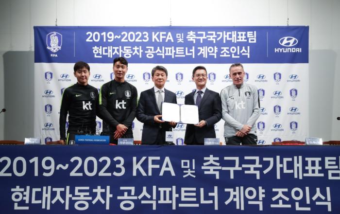 현대자동차가 대한축구협회 및 축구 국가대표팀과 2023년까지 공식 파트너십을 연장한다.현대자동차(주)는 7일 파주 NFC(경기도 파주시 탄현면 소재)에서 이광국 현대자동차 국내사업본부 부사장, 정몽규 대한축구협회 회장, 파울로 벤투 한국 축구 국가대표팀 감독 및 선수