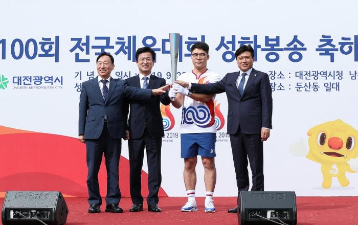 ‘제100회 전국체전 및 제39회 장애인체전 기념 대전구간 성화봉송’이 23일 오후 2시 시청 남문광장에서 개최됐다.대전시에 따르면 이번 성화봉송은 전국체전 100회를 기념해 역대 개최지를 잇는 전국적인 봉송으로, 총 1,100명의 주자가 참여하고, 13일 동안 총 2