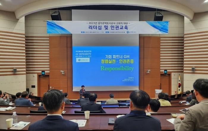 경기주택도시공사(GH)가 24일 경기도 수원시 차세대융합기술연구원에서 처장급 이상(사장 및 임원 포함) 고위직을 대상으로 '2023년 고위직 맞춤형 통합폭력예방교육'을 실시했다고 밝혔다. 이번 교육은 사장 및 임원을 포함한 처장급 이상 관리자 등이 참여한 가운데 집