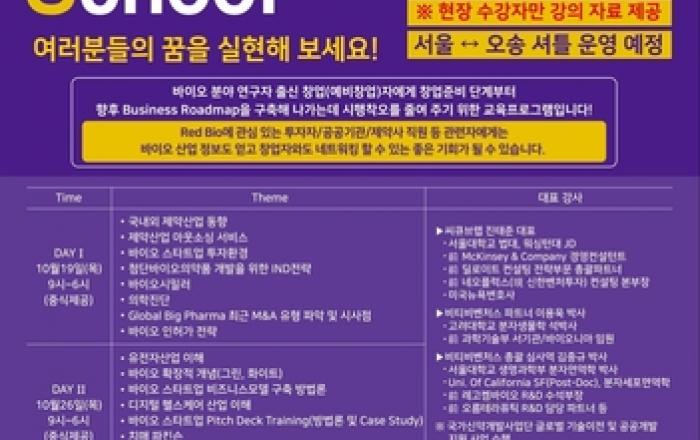 충청북도는 충북창조경제혁신센터 주관으로 바이오 창업 전문교육 과정(바이오창업아카데미)인 바이오 벤치마킹 스쿨(Bio Benchmarking School)과 메드텍 스쿨(Medtech School) 하반기 교육을 진행한다. 바이오 벤치마킹 스쿨은 바이오 분야 연구자