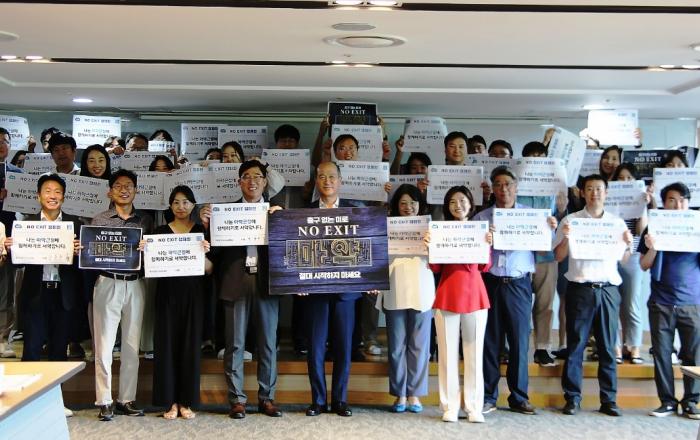 경기도농수산진흥원이 8일 마약 근절 ‘노 엑시트(NO EXIT)’ 릴레이 캠페인에 동참했다. 이번 캠페인은 경찰청이 지난 4월말부터 연말까지 한국마약퇴치운동본부와 관계부처 합동으로 마약중독의 위험성 고취와 마약 범죄 예방을