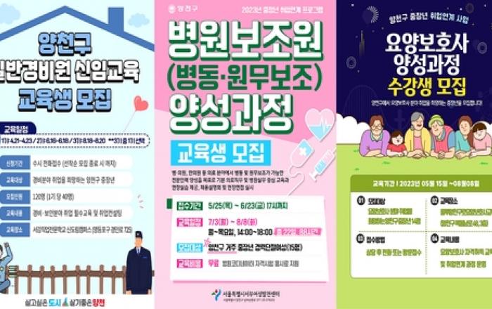 양천구는 은퇴 후에도 활발한 사회활동을 희망하는 중장년을 대상으로 경비원, 요양보호사 등 다양한 취업연계형 무료 직업교육 프로그램을 운영하고 참여할 수강생을 모집한다고 밝혔다. 중장년 취업연계 직업교육은 구와 업무협약을 체결한 직업훈련기관(단체)에서 직무교육을 이수