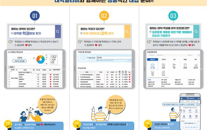대학 등록금, 기숙사, 산학협력 현황 등 대학의 주요 정보를 정확하고 편리하게 확인하는 곳, ‘대학알리미’가 있다. 대학알리미는 학생, 학부모, 교사, 기업, 대학 등 교육수요자에게 고등교육기관 전반에 대한 정보와 서비스를 제공한다. 대학알리미 누리집은 지난 20