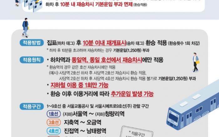 서울시는 오는 7월 1일부터 지하철 하차 후 10분 내 재승차시 기본운임을 면제(환승 적용)하는 제도를 시행한다고 밝혔다. 앞으로는 서울 지하철 이용중에 실수로 목적지를 지나치거나 화장실 등 긴급용무가 있는 경우 게이트에 교통카드만 태그하면 추가 요금을 납부할 필요 없