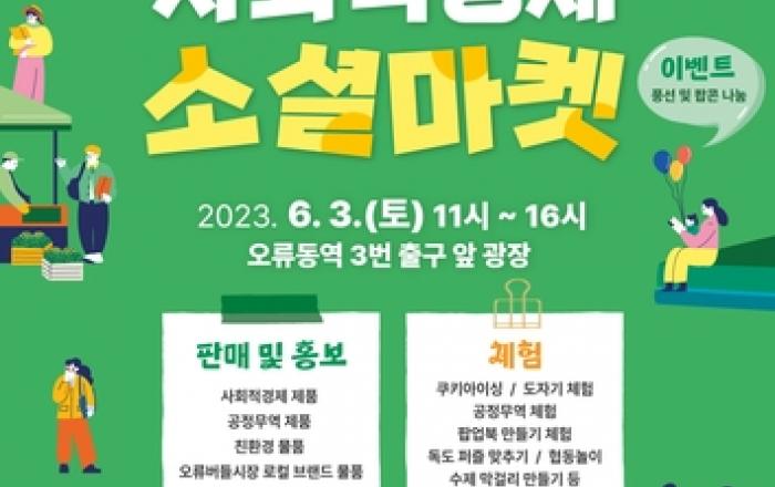 구로구는 오는 3일 오전 11시부터 오후 4시까지 오류동역 광장(3번 출구)에서 사회적경제 활성화를 위한 '2023년 구로구 사회적경제 소셜마켓'이 열린다고 밝혔다. 구로사회적경제통합지원센터와 구로사회적경제 사회적협동조합이 공동으로 주최하는 '구로구 사회적경제 소셜