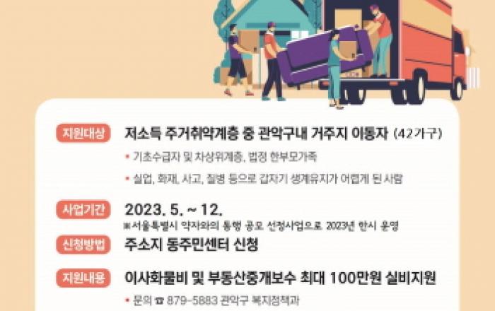 서울 관악구가 주거 취약계층의 주거 상향과 안정적인 정착을 위해 안심이사서비스 지원사업을 추진한다. 구는 서울시 2023년 약자와의 동행 자치구 지원사업 공모에 선정돼 이사 비용 부담이 큰 주거 취약계층에 도움을 주고자 이사화물 운송비와 부동산 중개보수료를 최대 1