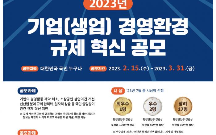 충청북도는 도민의 눈높이에서 기업과 소상공인의 경영환경 개선 등 도민 살림살이 관련 규제혁신 과제를 발굴하고 해소하기 위하여 ‘2023년 충청북도 기업(생업) 경영환경 규제 개선 도민 공모’를 추진한다고 16일 밝혔다. 이번 공모전은 기업의 경영활동 제약 해소, 소