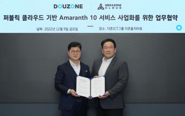 더존비즈온은 9일 서울 중구 더존을지타워에서 메가존클라우드와 ‘Amaranth 10(아마란스 텐)’ 서비스 사업화와 글로벌 시장 확대를 위한 업무협약(MOU)을 체결했다고 밝혔다.이번 협약은 양사 간 Amaranth 10 파트너십 강화 및 글로벌 진출에 필요한 유기적인