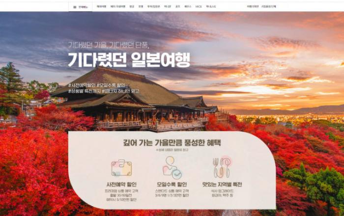 하나투어가 일본의 가을 단풍 절경을 감상할 수 있는 ‘기다렸던 일본여행’ 기획전을 선보였다.일본 정부는 외국인 관광객 무비자 입국과 개인 자유 여행을 허용하고, 하루 입국자 수 상한을 폐지한다고 발표했다. 코로나 팬데믹으로 2020년 3월 중단된 일본 무비자 입국이 2