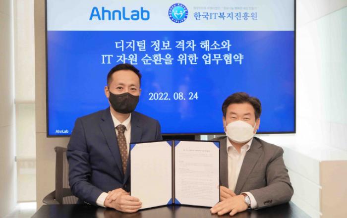 안랩이 24일 한국IT복지진흥원과 성남 지역 내 디지털 정보 격차 해소와 IT 자원 순환을 위한 업무 협약(MOU)을 체결했다고 25일 밝혔다.이번 MOU로 안랩은 사내 불용 IT 자산을 한국IT복지진흥원에 기증하고, 한국IT복지진흥원은 기증받은 물품을 재정비(점검·수