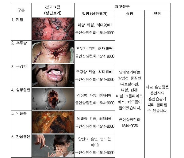 새롭게 바뀌는 경고그림과 문구의 특징을 보면 먼저 암, 구강암, 심장질환, 뇌졸중 등 9종의 경고그림은 새로운 그림으로 교체, 경고효과를 극대화하고자 했다. 경고그림의 효과성 및 익숙함 방지의 필요성 등을 종합적으로 고려해 새로운 그림으로 교체했다.