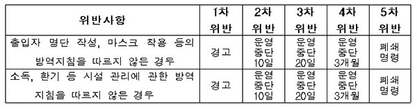 아울러 마스크 착용 등 방역지침 준수 명령을 위반한 시설·장소에 대해 1차 위반 시 경고, 2차 위반 시 운영중단 10일, 3차 위반 시 운영중단 20일, 4차 위반 시 운영중단 3개월, 5차 위반 시 폐쇄명령 처분이 가능하도록 행정처분 세부기준을 마련했다.